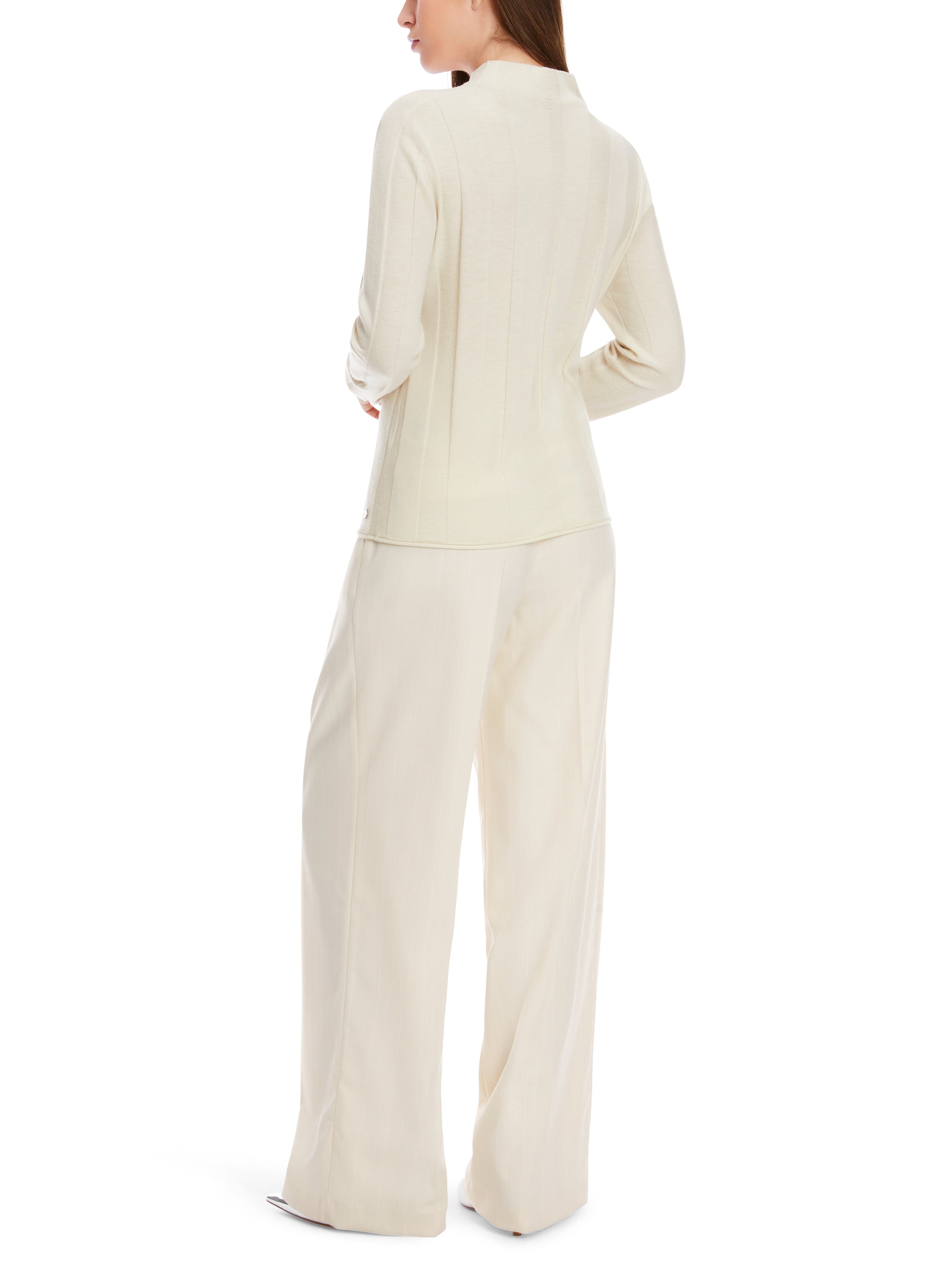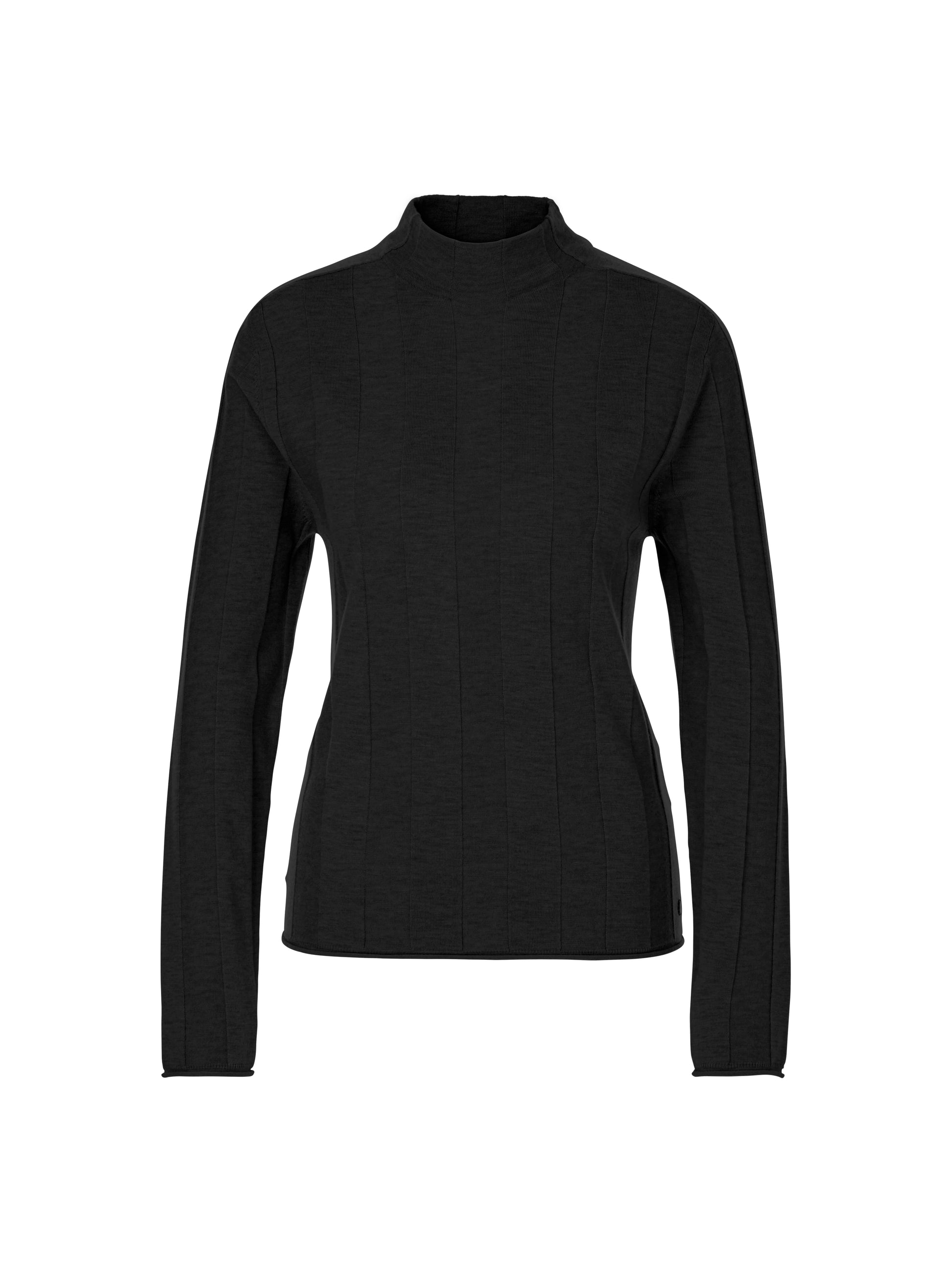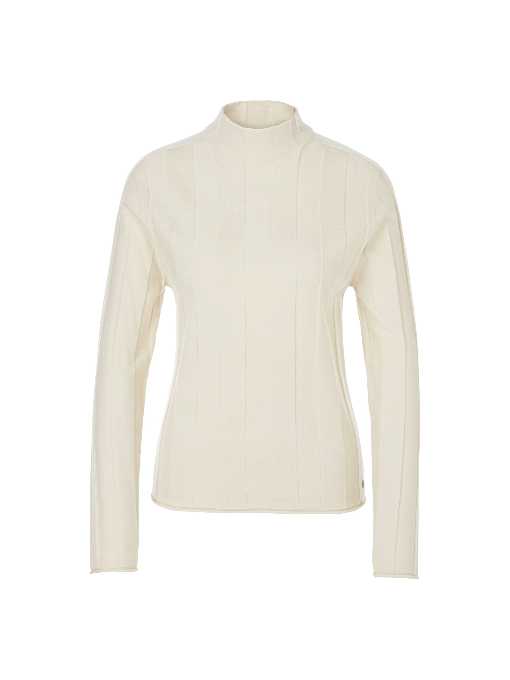 Knitted sweater made from a wool-based materials blend with cashmere. The knit has a wide textured stripe. The shape is straight and the cut is moderately wide. The turtleneck is seamless at the front and back. The hems are finished with rolled edges.