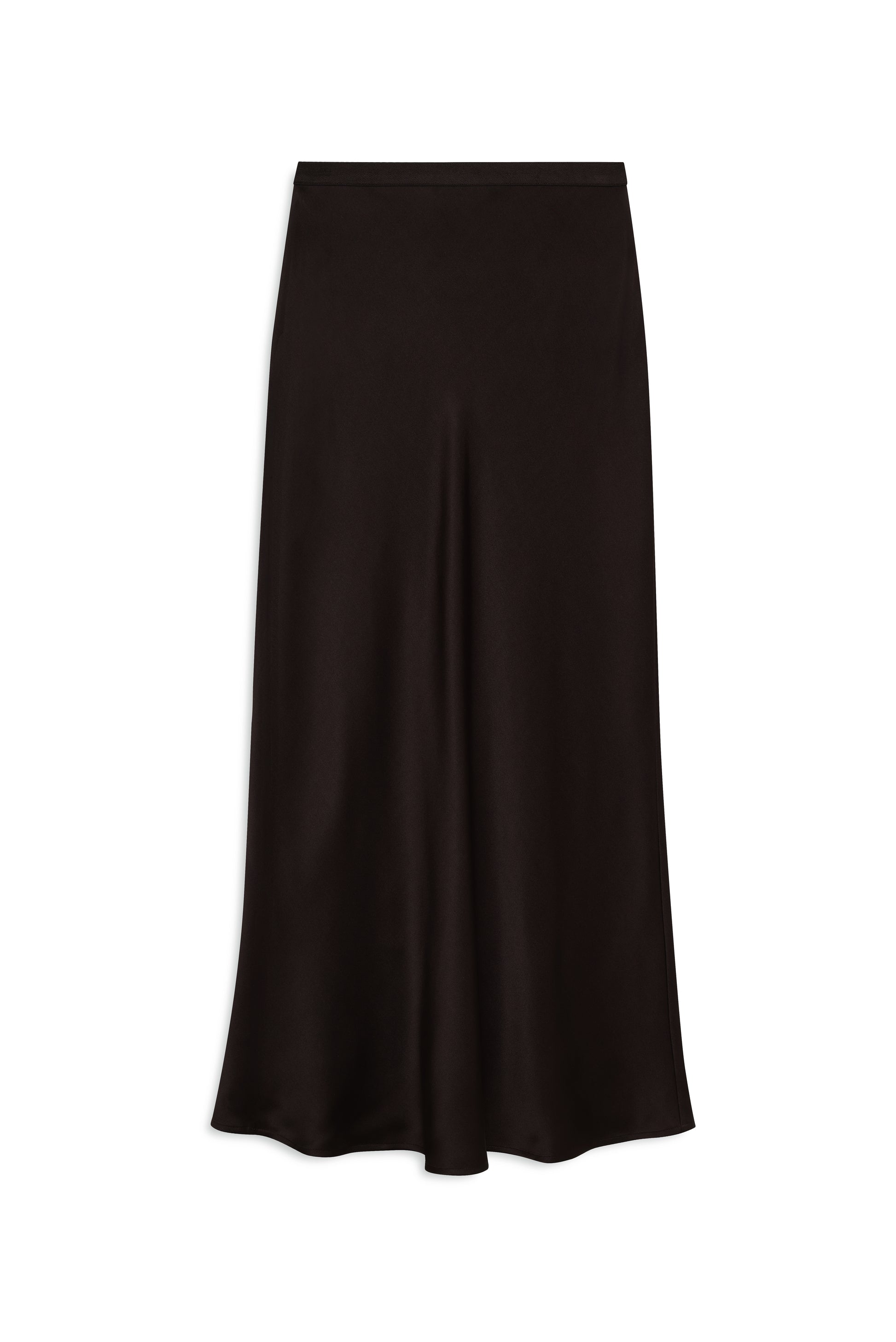 Crafted from premium double-faced silk charmeuse, this beloved Bar Silk Skirt delivers a refined silhouette through its bias-cut construction. The high-waisted design sits elegantly at the natural waist while the midi length provides sophisticated coverage. An elasticated waistband ensures effortless wear with a streamlined fit that contours gracefully through the hips. The deep brown tone offers versatile styling across seasons. Wear true to size for optimal proportions.