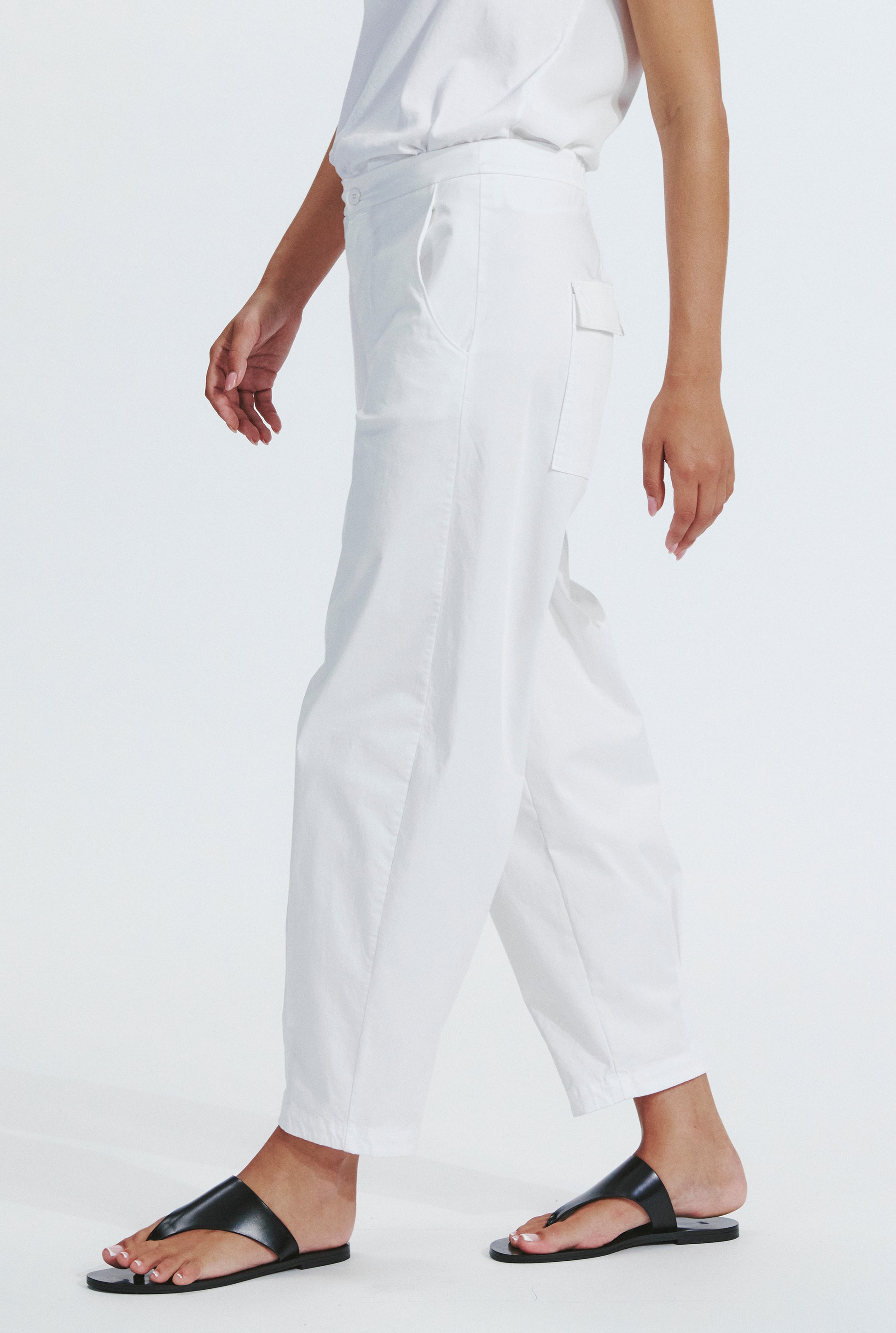 Lightweight, cotton poplin pants with a gentle barrel shape, button and fly closure and side and rear pockets.