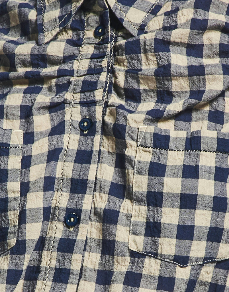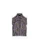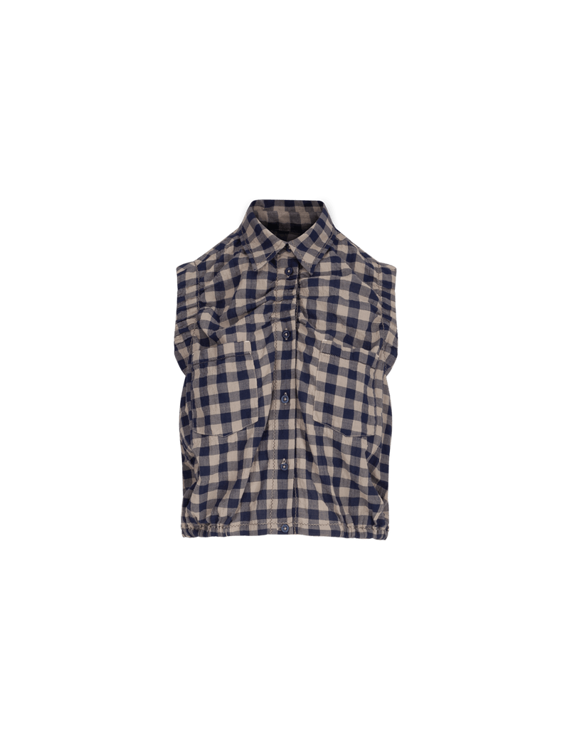 The classic shirt collar and front button closure give the Breathe checkered top a formal look that balances the relaxed vibe of the gingham fabric and cropped cut. Fitted at the top and slightly gathered at the hem, it has a cropped fit that reveals the waistline. Turn-down collar. Front button closure. Patch pockets on the chest. Slightly gathered elasticized hem. Visible stitching. Sleeveless. • Seersucker, lightweight, crêpe handfeel.