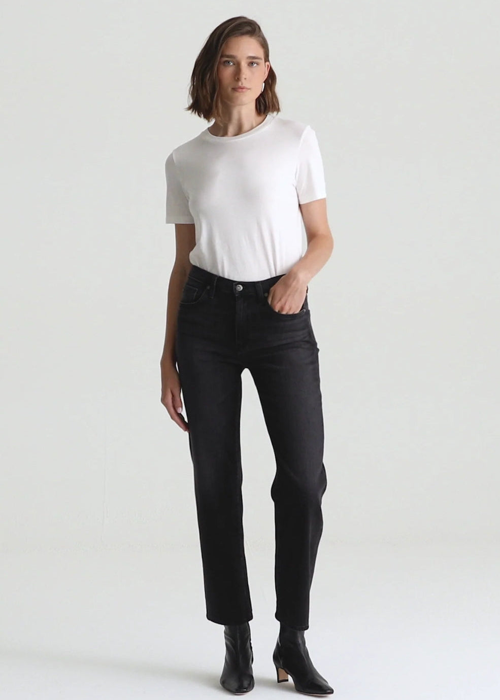 Brinley is a mid-rise straight in faded black denim. These five-pocket women's jeans sit right at the natural waist and fall to the perfect straight-leg silhouette for year-round styling. The pair here comes in 9.3 oz. Midnight Comfort Stretch denim for a bit of give right where you need it.