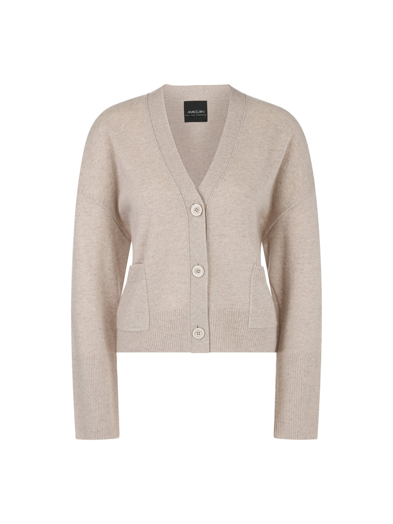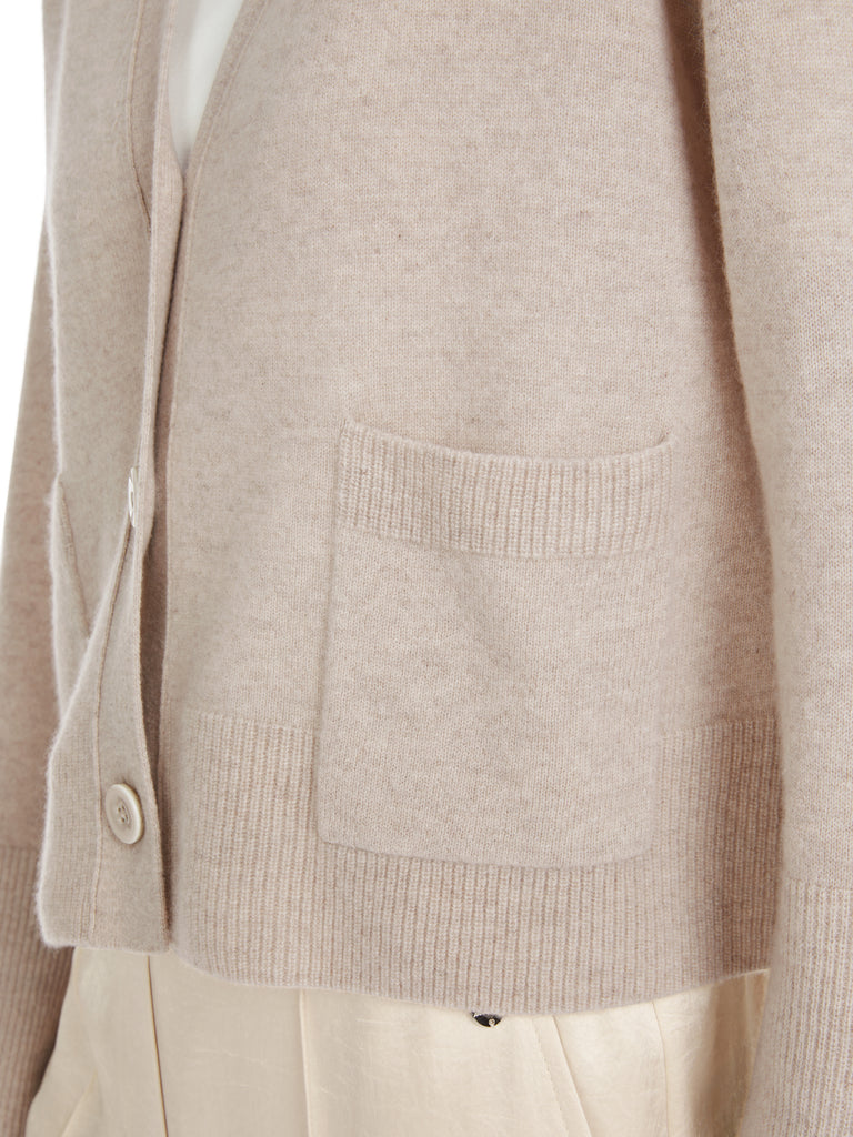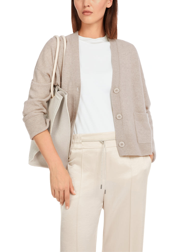 A successful blend of fine cashmere with a relaxed silhouette, this cardigan comes with dropped shoulders and a V-neck. The front is buttoned and has pockets. The fine material impresses with its skin-friendly comfort