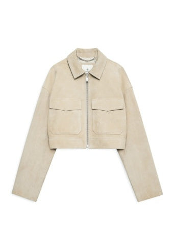 This refined suede jacket combines understated elegance with functional design. Constructed from premium midweight suede in a luxurious sand tone, it features a cropped silhouette that works seamlessly with contemporary wardrobes. The dropped shoulder seams create a relaxed, intentional fit, while two generously proportioned patch pockets deliver practical storage. A central zip fastening ensures effortless styling versatility. An investment piece that transcends seasonal trends.