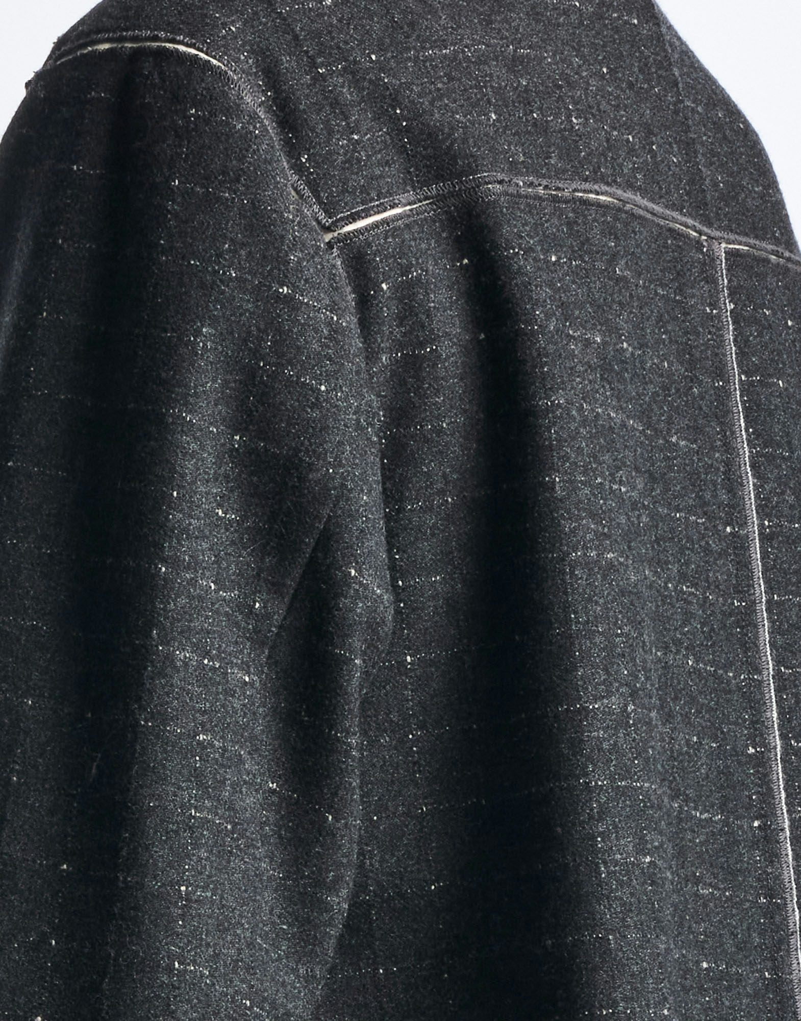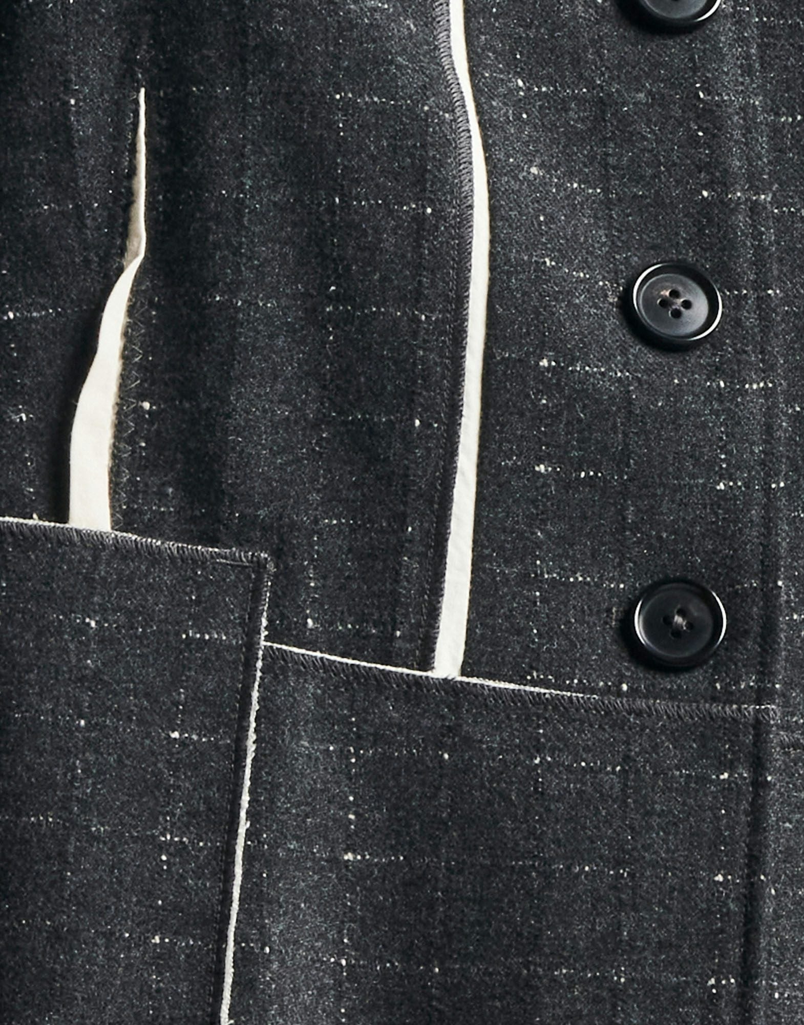 Short boxy-cut jacket in wool mix broken check flannel. Turn down collar on a button-thru front fastened with navy buttons. Open seam construction throughout revealing a ivory crinkle cotton lining and seam finished with a overstitch and decorated with contrast ivory blanket stitch. Unstructured shoulders over inset sleeves finishing in split cuffs. Overstitched patch pockets at the front. Reverse has back yoke, centre seam and curved waist seam with flared panel which drapes into a gentle swing-back shape.