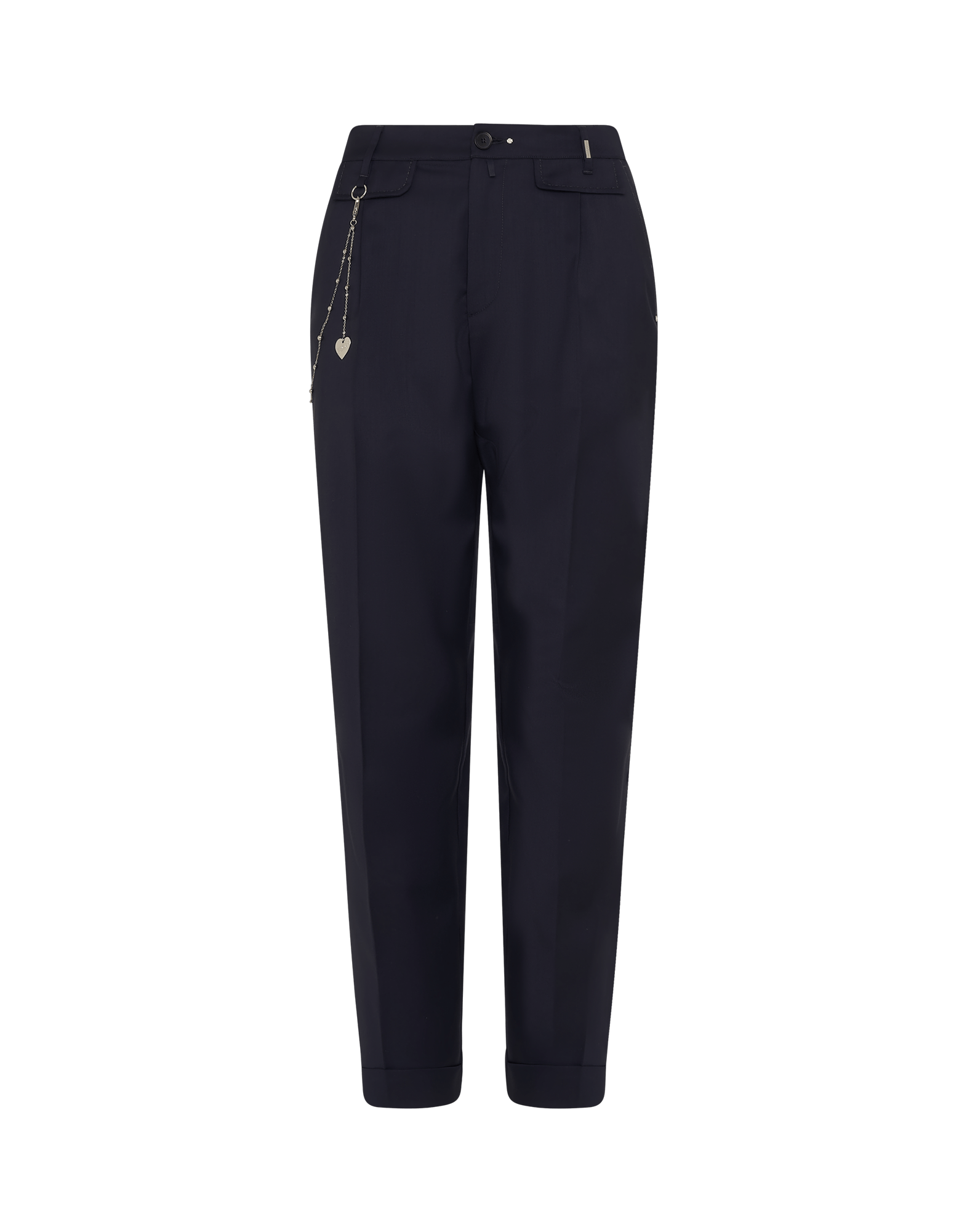 Tailored pant in pure virgin wool twill with a fixed waistband and belt loops fastened with a single horn button over a fly front with a silver metal zip. Fronts have slanting hip pockets and a single pleat under decorative ticket pocket flaps which extends into a centre leg crease. Reverse has darts into the waist and two back patch pockets with a horizontal seam running behind the leg above the knee. Tapered legs finish in stitched-up turn-ups. Decorative saddle stitch.