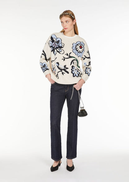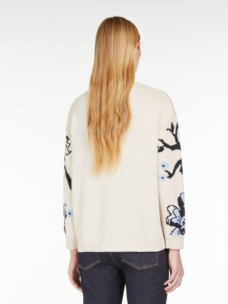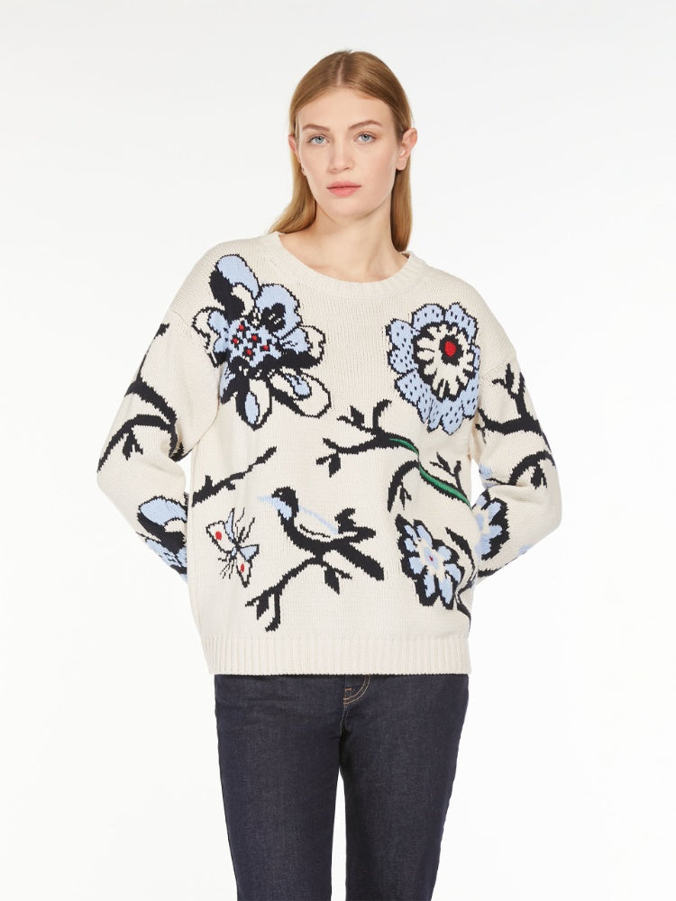 Cotton yarn crew-neck sweater featuring inlaid floral detail on the front and sleeves. The relaxed-fit model boasts a standard length, in addition to drop-shoulder long sleeves and rib-knit trims.
