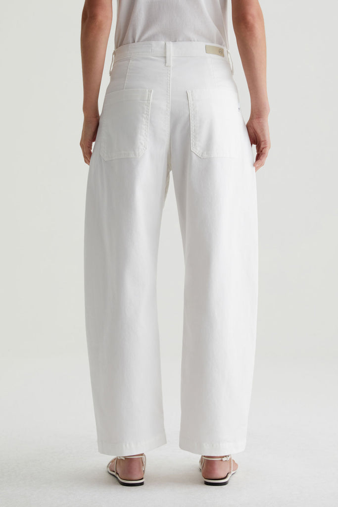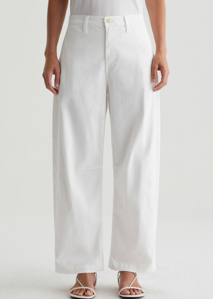 Fiona is a barrel-leg chino with a high waist and slant front pockets. Landing at an ankle-skimming length, it's got slightly curved outer seams and darting at the inner knees. Done in an off-white shade, these barrel-leg trousers have a soft, supple feel in 7.9 oz. Sorrento Stretch Twill from Italy.