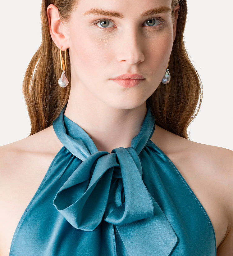 french hook earrings with a sinuous shape and lightweight gold–tone structure embellished with dangling baroque pearls. the imperfect lines serve as a reminder that these french hook earrings are exquisitely crafted, pretty bijoux that bring light to the face during the day and reflect the glow of the moon at night.
