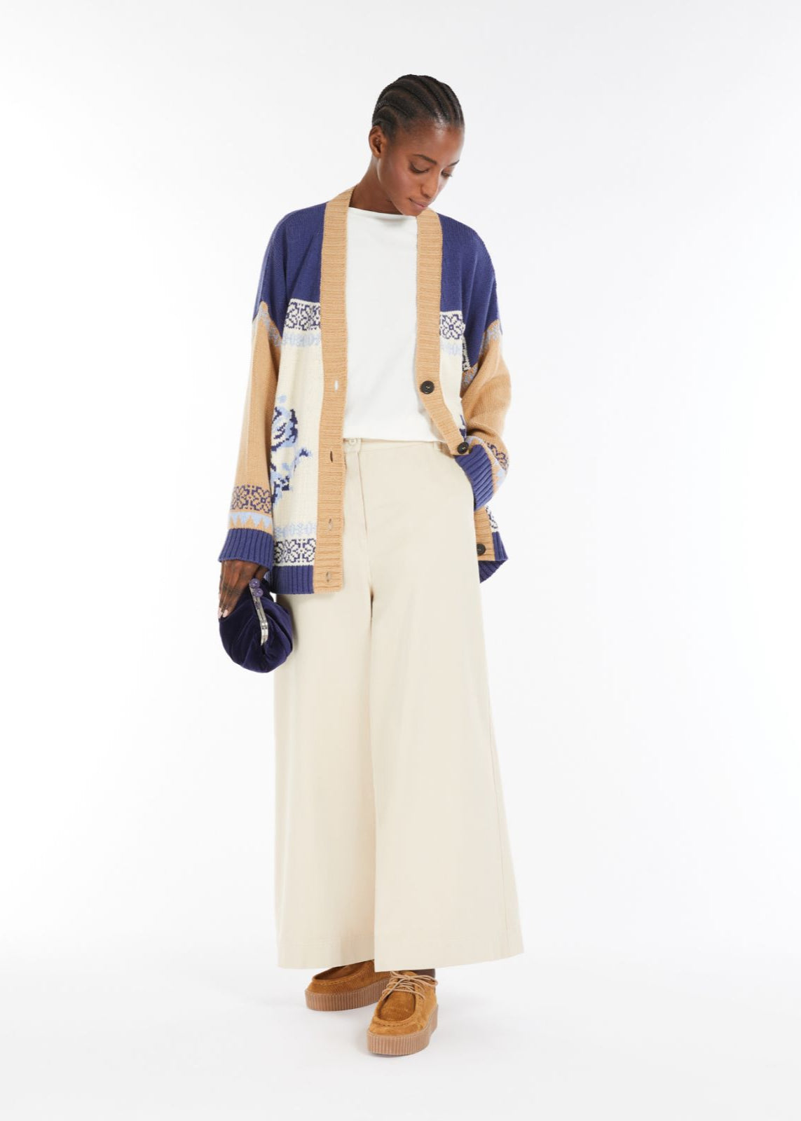 Colourblock cardigan in soft cotton yarn featuring a jacquard pattern and placed inlay detail. The oversized model boasts dropped shoulders, a V-neckline, long sleeves and rib-knit trims. Horn-look button fastening.