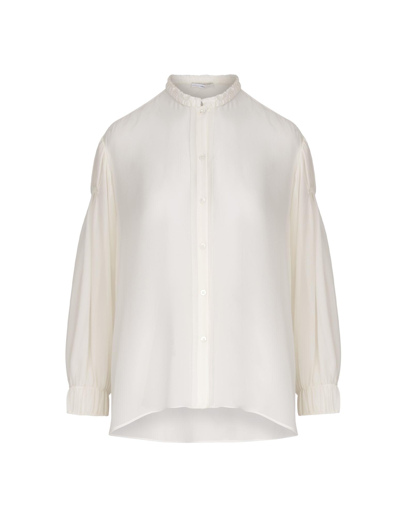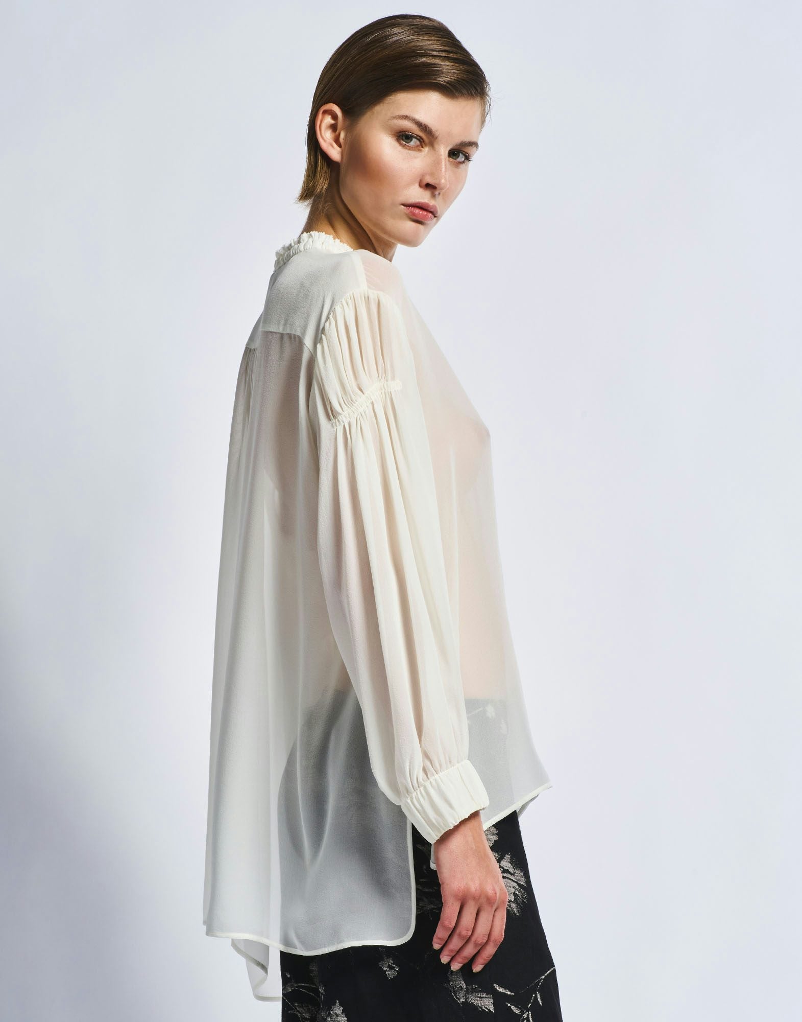 The Jasmine blouse in ivory silk georgette is ultra-light, sheer, and features sophisticated à jour embroidery and gathered detailing along the collar, sleeves, and cuffs. With its loose and long cut, the blouse offers a relaxed fit that follows the silhouette without constraint, making it a versatile piece with retro charm. Gathered mandarin collar. Long sleeves. Front button closure. À jour embroidery. • Silk georgette, ultra-lightweight, crêpe texture. • Sheer. • Wrinkle-resistant.
