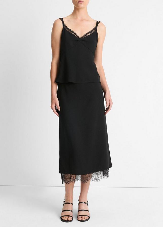 This sleek crepe camisole is detailed with double straps and eyelash floral lace trim for a lingerie-inspired twist on a classic, feminine staple. Slips on with Adjustable straps.