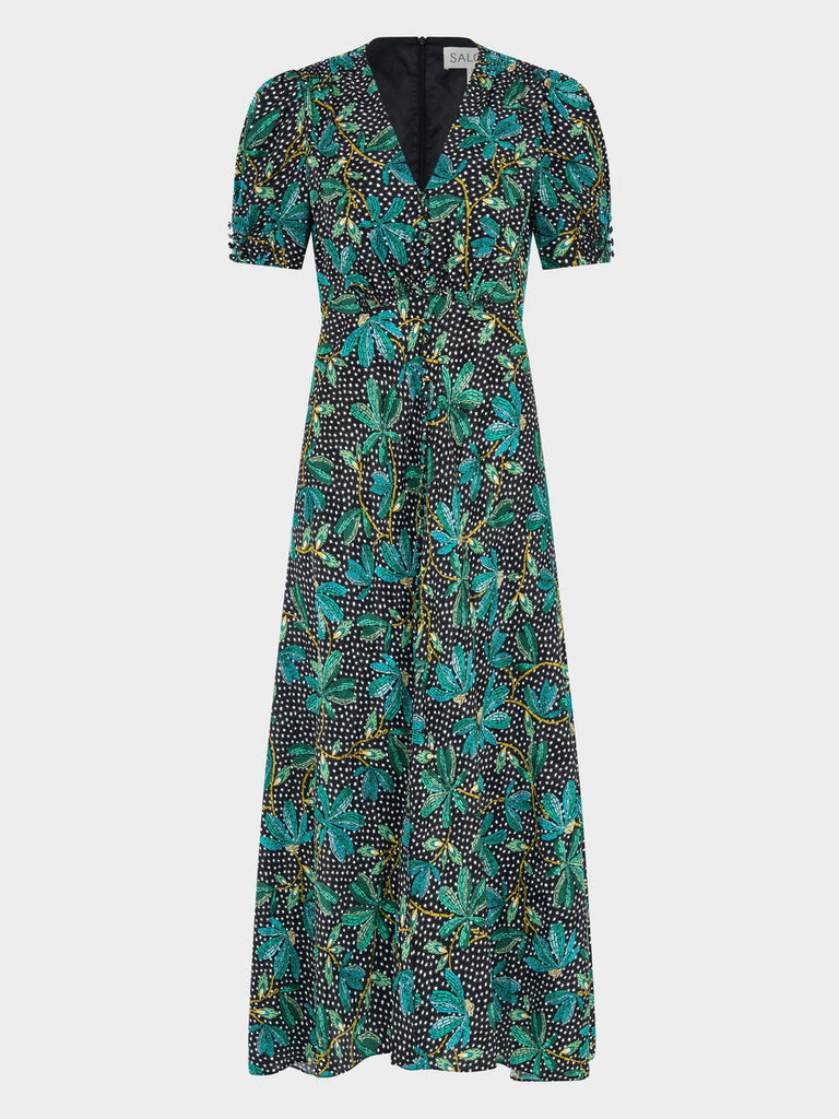 A signature SALONI silhouette, the Lea Long Dress is a timeless favourite loved for its effortless elegance and flattering form. Cut on the bias, it skims the body beautifully, creating graceful movement with every step. Tonal teal papercut flowers bloom across a base of delicate micro polka dots, adding depth and texture to this refined, feminine piece, perfect for elevated everyday wear.