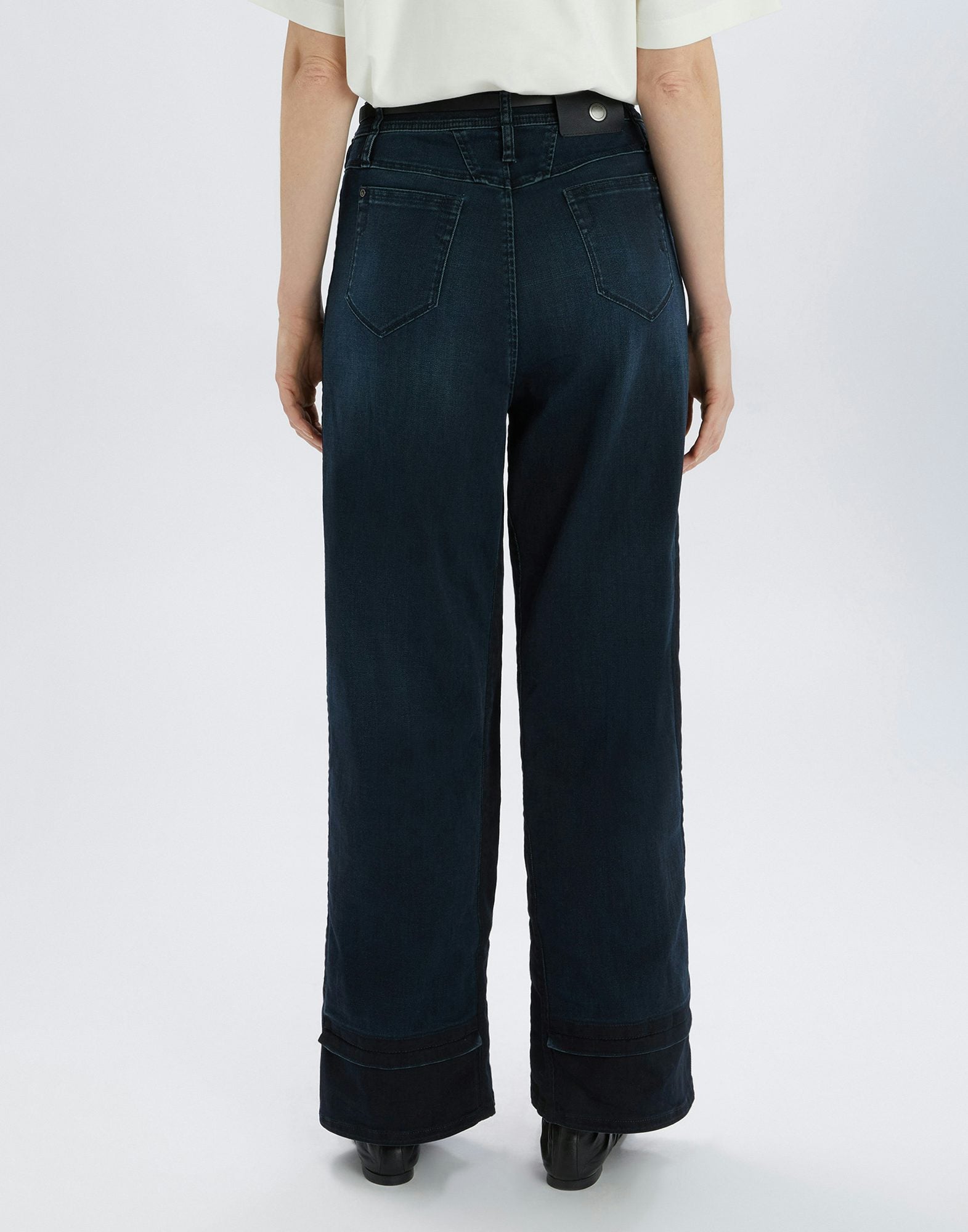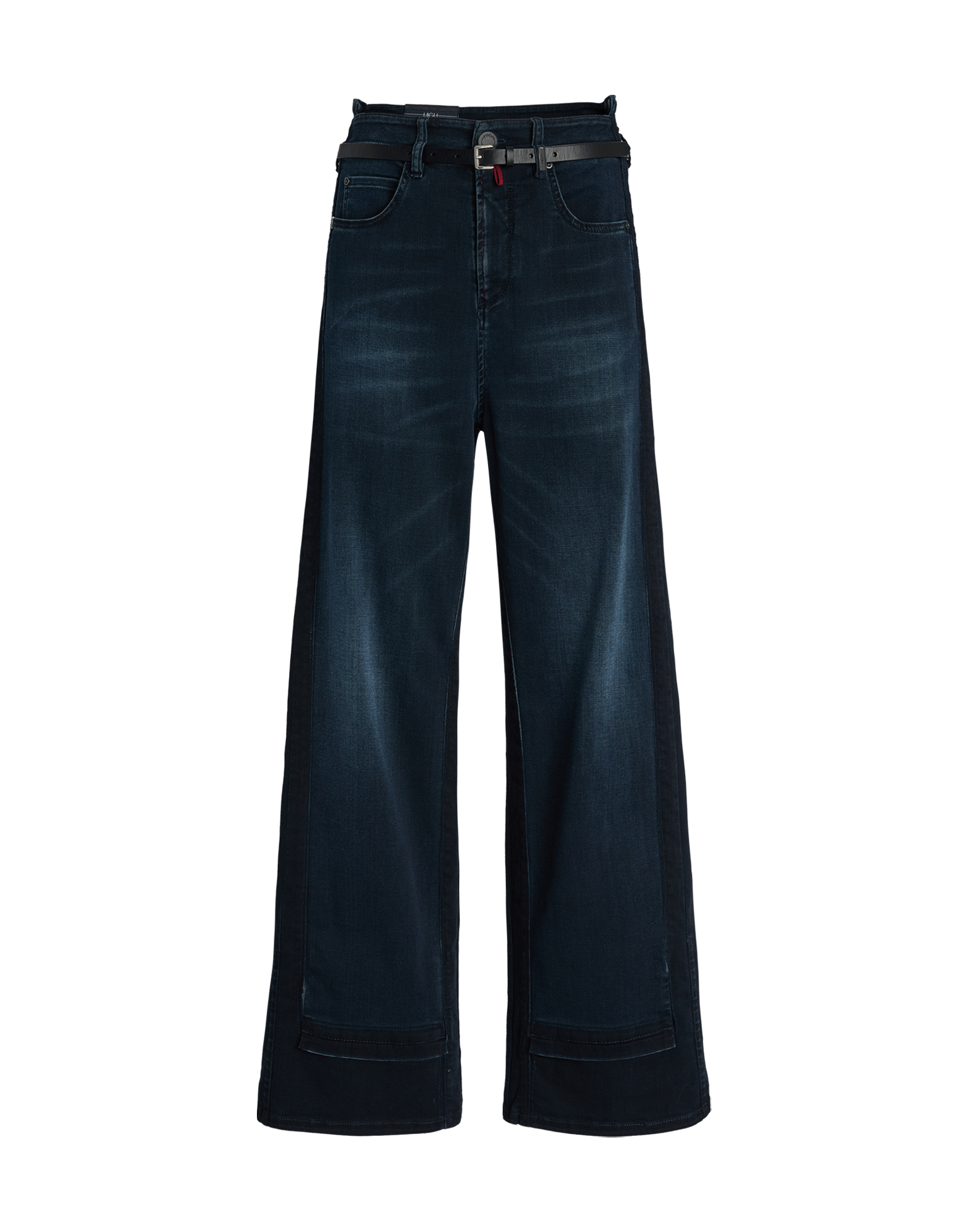 A traditional, menswear-inspired style with a wide, straight leg is reinterpreted with a fresh perspective: the lowered front waistband highlights the slim leather belt, creating a trompe-l'œil effect. Waistband with belt loops and front button. Front zip fly with metal zipper. Slim leather belt. Side pockets and coin pocket. Two patch pockets at the back. Darker denim inserts at the side and hem. Visible topstitching and seams. • Stretch denim, medium weight, compact handfeel. • TREATMENT: the garment is prepared with reserved areas to emphasize light/dark contrasts. It is then manually scraped and enzyme-washed for a worn-in finish. Each piece has a unique look due to the treatment.