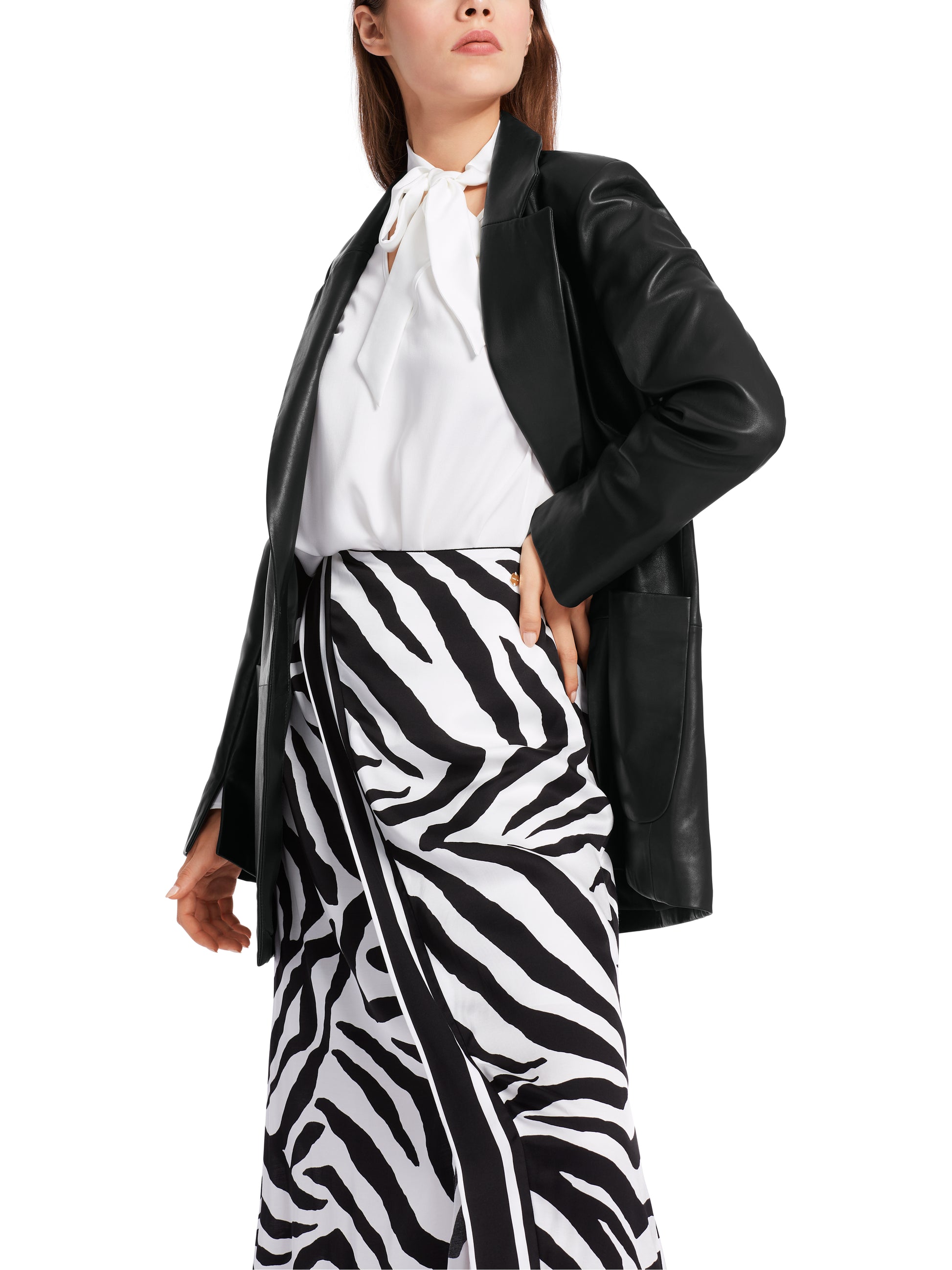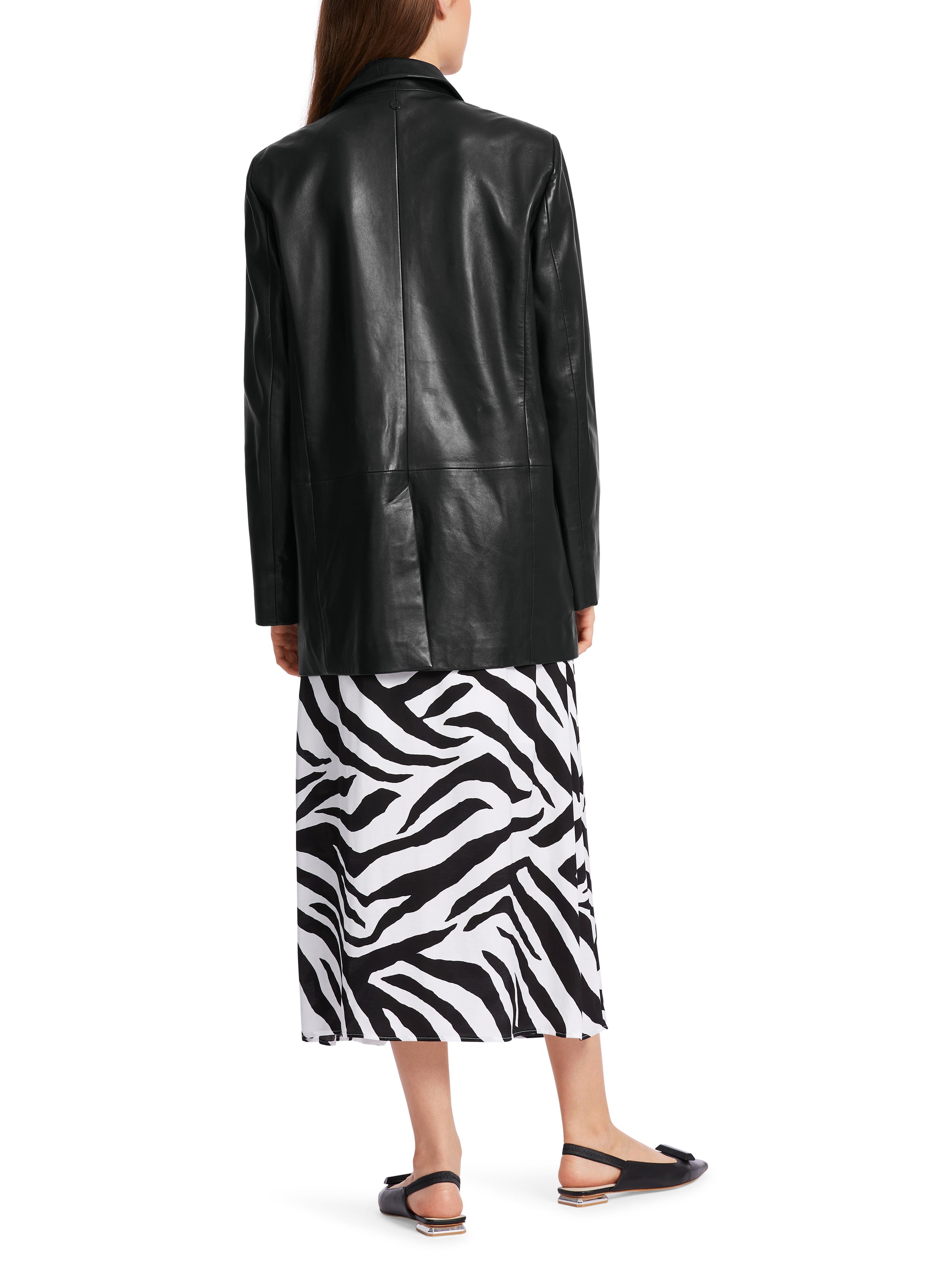 This blazer is made from soft nappa leather. It features classic elements such as a lapel and patch pockets. The silhouette is accentuated by dividing seams and darts to accentuate the figure. There is a slit at the sleeve hem and at the back. The blazer is fastened with a button.