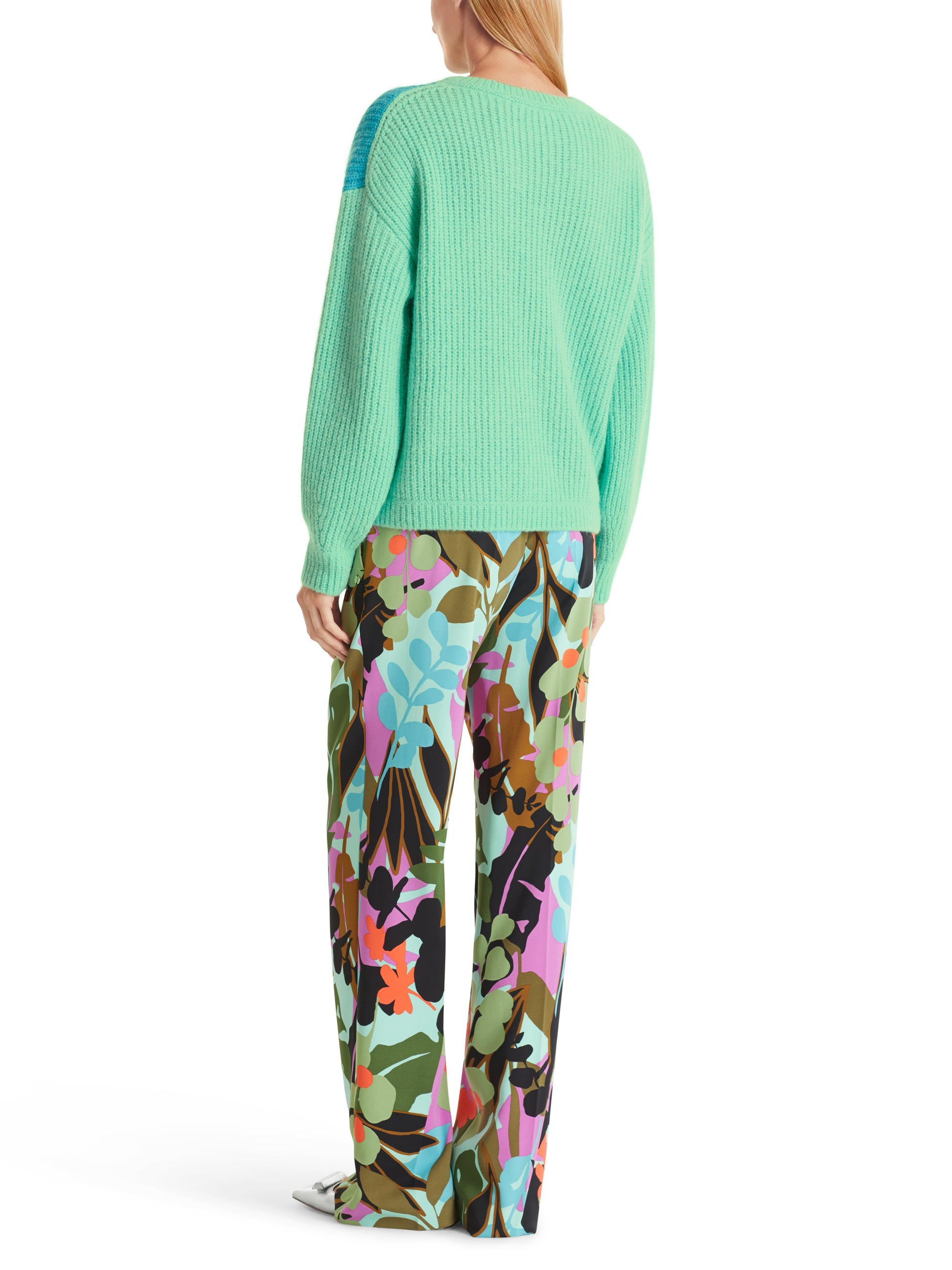 The colourful colour-blocking design draws the eye to this sweater. The sweater has a relaxed silhouette and a round neck. Its knit presents a patent pattern in a mix of materials with wool and alpaca. The sweater is knitted and also finished at the location in Germany. Further processing of the individual parts takes place in European partner companies. This makes the item "Knitted in Germany".