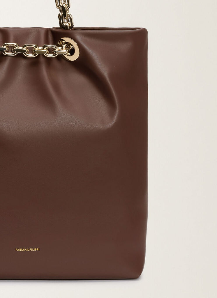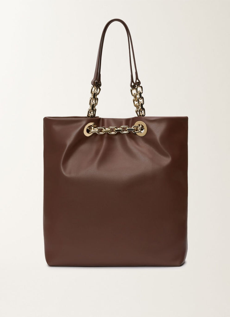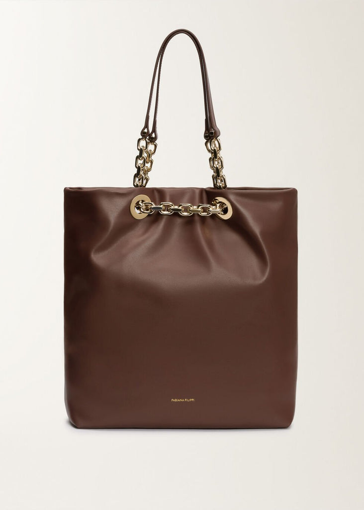 Comfort is combined with style in this eyelet shopper with a contemporary design. The refined nappa leather envelops the accessory in a relaxed softness, while the chain detail highlights its uniqueness. Entirely produced in Italy, with a particular focus on sustainability.