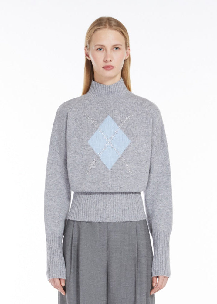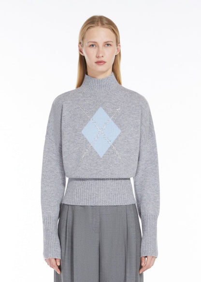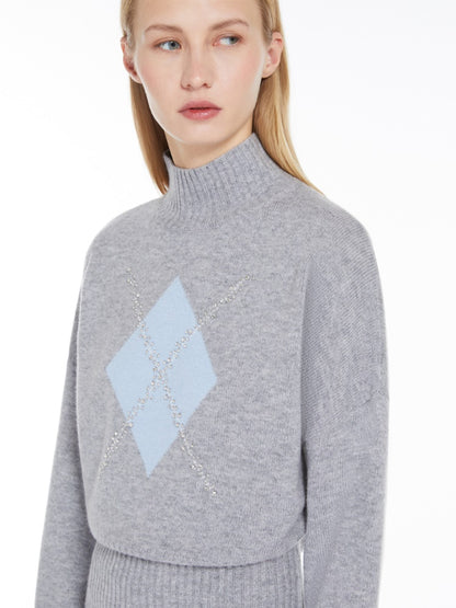 Polo neck jumper in a cashmere-blend yarn, with diamond intarsia pattern on the front, embellished with embroidered bezels. The garment has a distinctive feminine silhouette with a high, figure-hugging ribbed hem, which highlights the waist, and low set-in sleeves. Ribbed finish on the collar and cuffs.