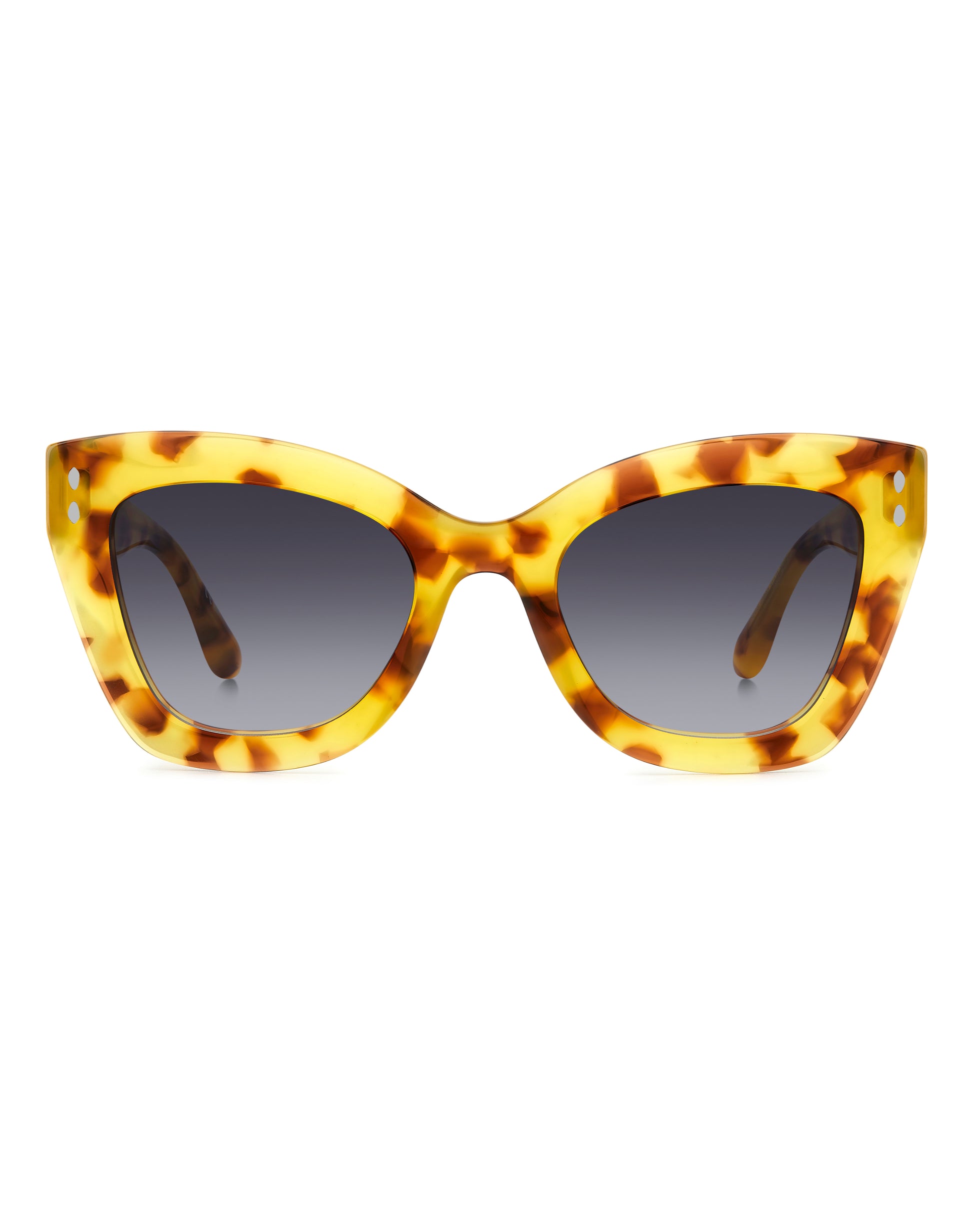 These sunglasses feature a solid-colored acetate frame with a semi-transparent finish. They present a square cat-eye design paired with smoke gradient lenses. The temples are adorned with a silver printed "Isabel Marant" logo, while the brand name is also engraved inside the temples for a refined detail.