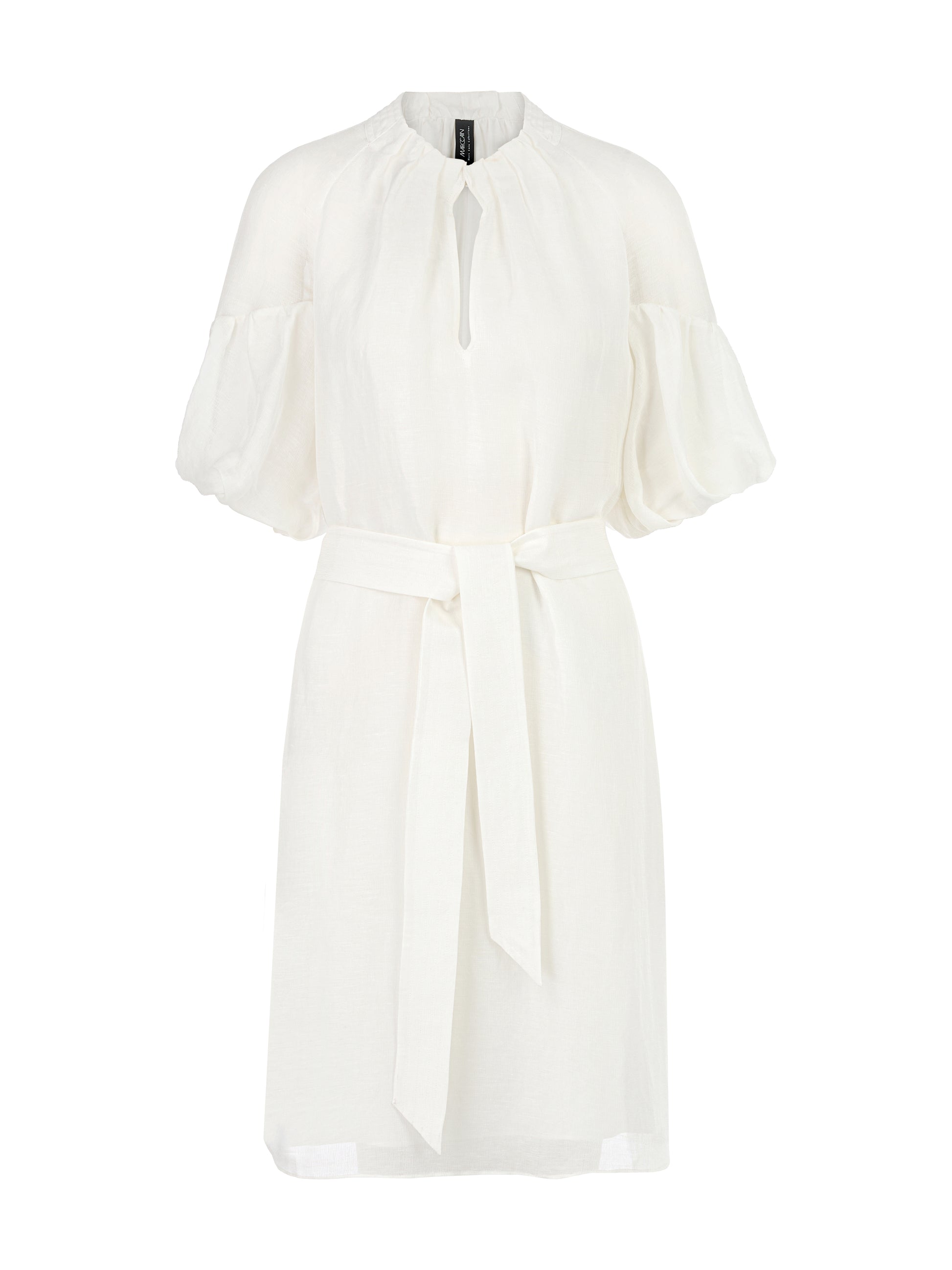 Short dress in fine linen/silk blend. Classic linen with a coarse weave. This dress has an A-line cut and accentuated low-set balloon sleeves. The round neck is pleated. The waist can be emphasised with a tie belt. A style statement for special moments.