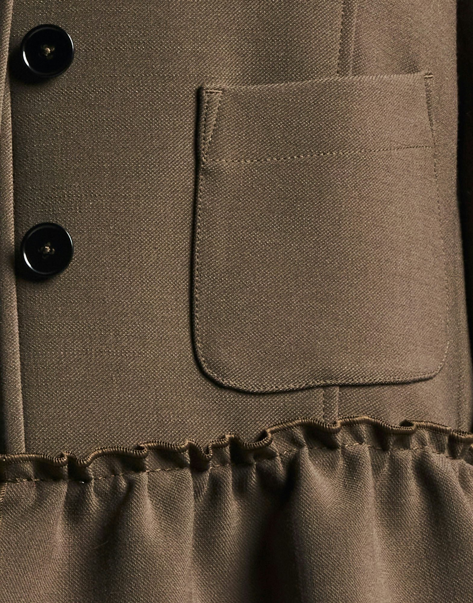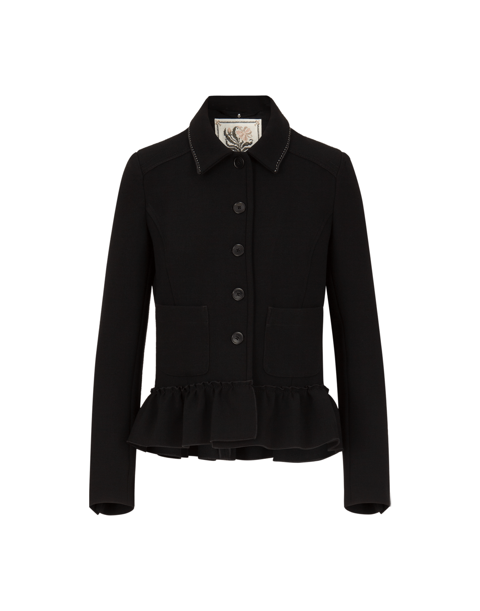 Boxy jacket in stretch wool twill. Soft turndown collar decorated with contrast ivory top stitching on a button-thru front. Overstitched shoulder yoke and fit seams from the shoulder to waist and two patch pockets in front. Slightly padded shoulders over inset sleeves that finish in three button cuffs. Reverse has a Western-style curved yoke over fit seams at the side and centre that open into deep folds creating a slight swing silhouette. Finished around the hem with a softly gathered on peplum with a ruffle top edge. Unlined Medium weight fabric Stretch Soft hand