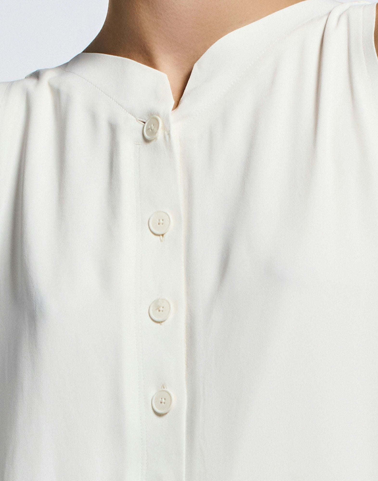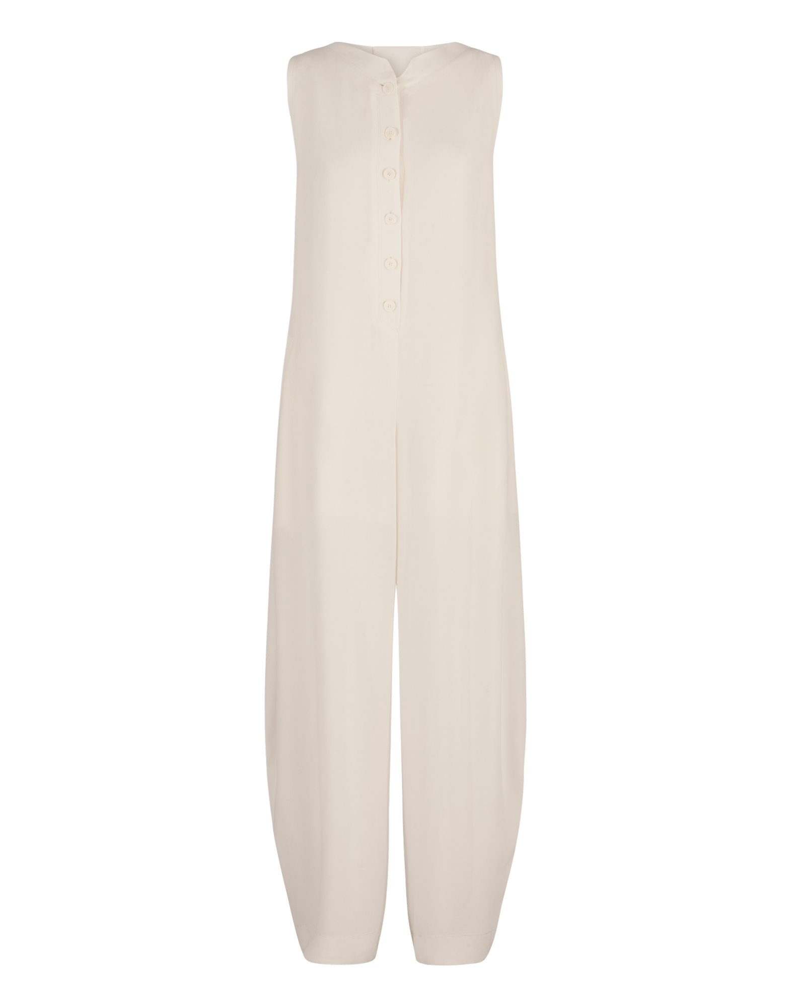 Fluidity and femininity are the distinctive features of the Progressive jumpsuit. Crafted from crêpe fabric, which provides a structured yet fluid texture, it features a slim-fitting upper section. The pants are wide and long, perfect to pair with heels. The double-buttoned belt at the back allows for waist adjustment. Sleeveless. Shaped neckline. Front button closure with black buttons. Vertical welt pockets along the sides. Back belt with double buttons for an adjustable fit. Two rear pockets. Low inseam. • Crêpe marocain, lightweight, fluid handfeel. • Lined to mid-thigh.