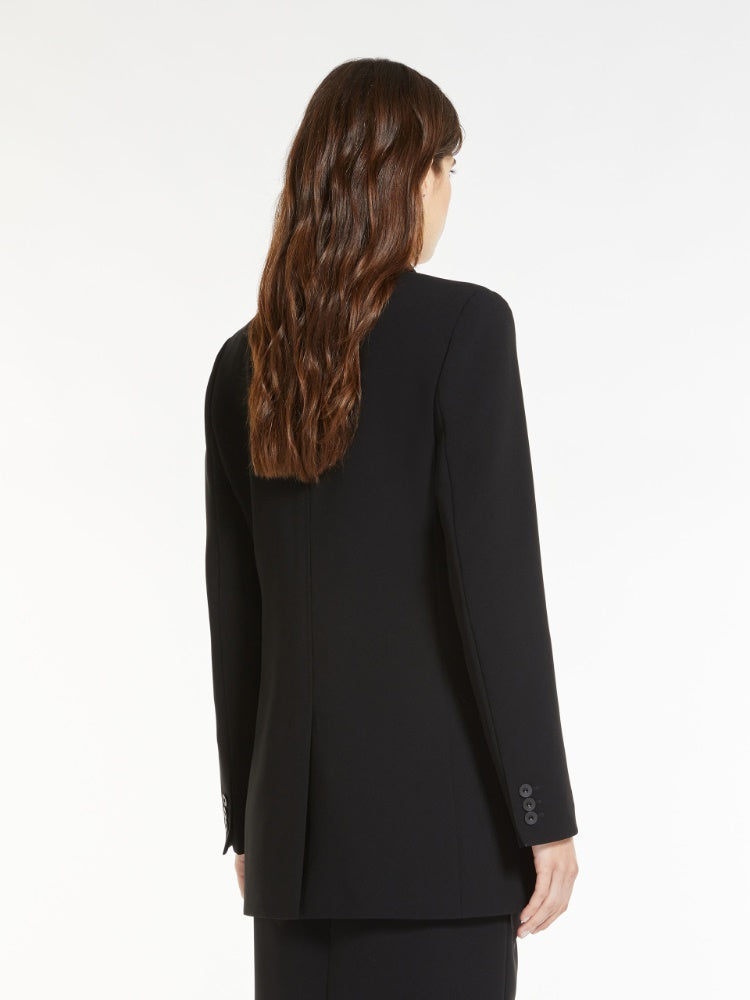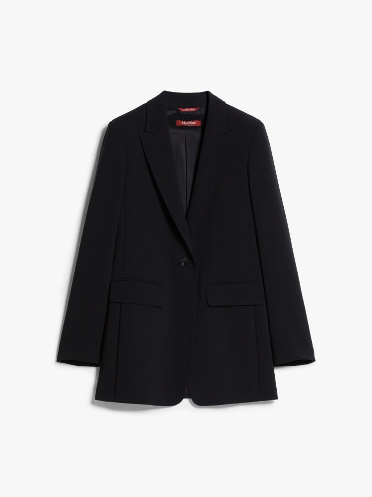 Figure-skimming blazer in fluid fabric featuring a lined interior and one-button fastening. Lapel collar, long sleeves and flap pockets.