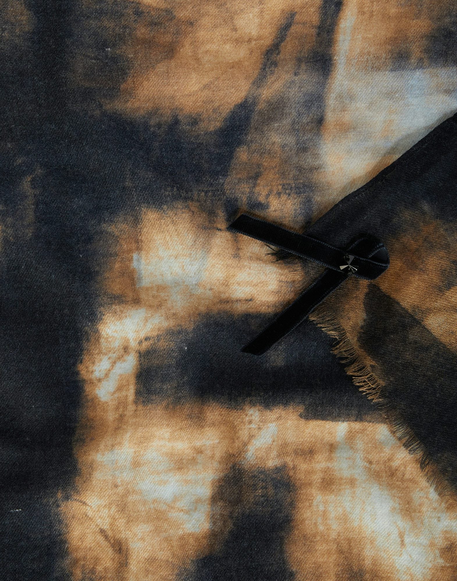 Lightweight and enveloping, the Savvy scarf is defined by its print, which recalls the hand-painted brushstrokes of an abstract artwork in a range of nuanced tones. Fringed edges. Velvet logo tape detail with button. • Wool gauze, lightweight, soft handfeel.