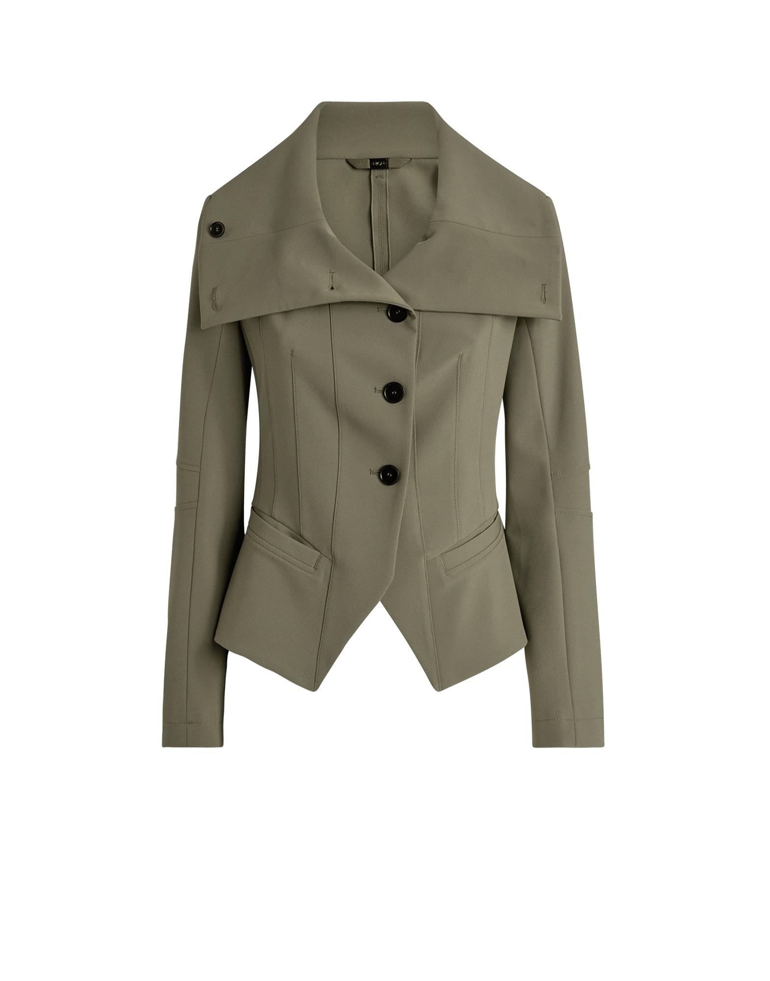 Made from fluid yet structured cady crêpe, the Scrunch jacket features a distinctive construction with a pointed front hem that creates a subtly flared shape, and a bold crater collar that can be worn open or buttoned up. Deep darts enhance the waistline for a flattering silhouette. Crater collar with buttons. Front button fastening. Long sleeves. Slanted front pockets. Front and sleeve darts. Exposed topstitching. Pointed front hem. • Cady crêpe, medium-weight, crêpe handfeel.