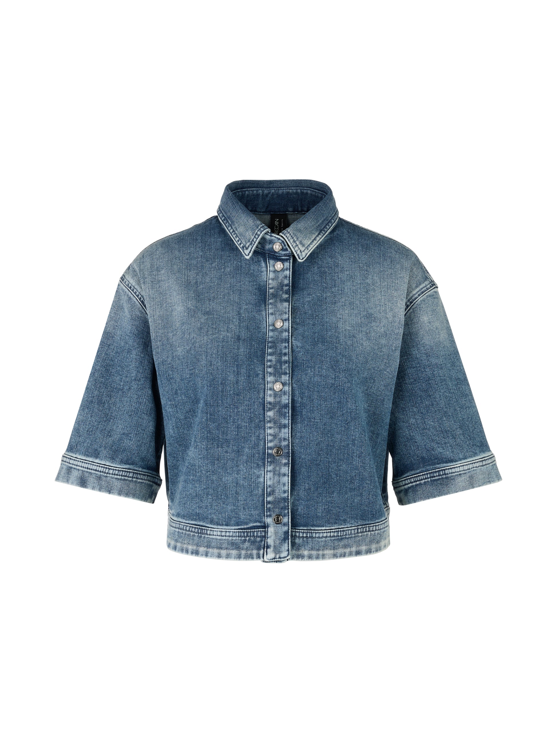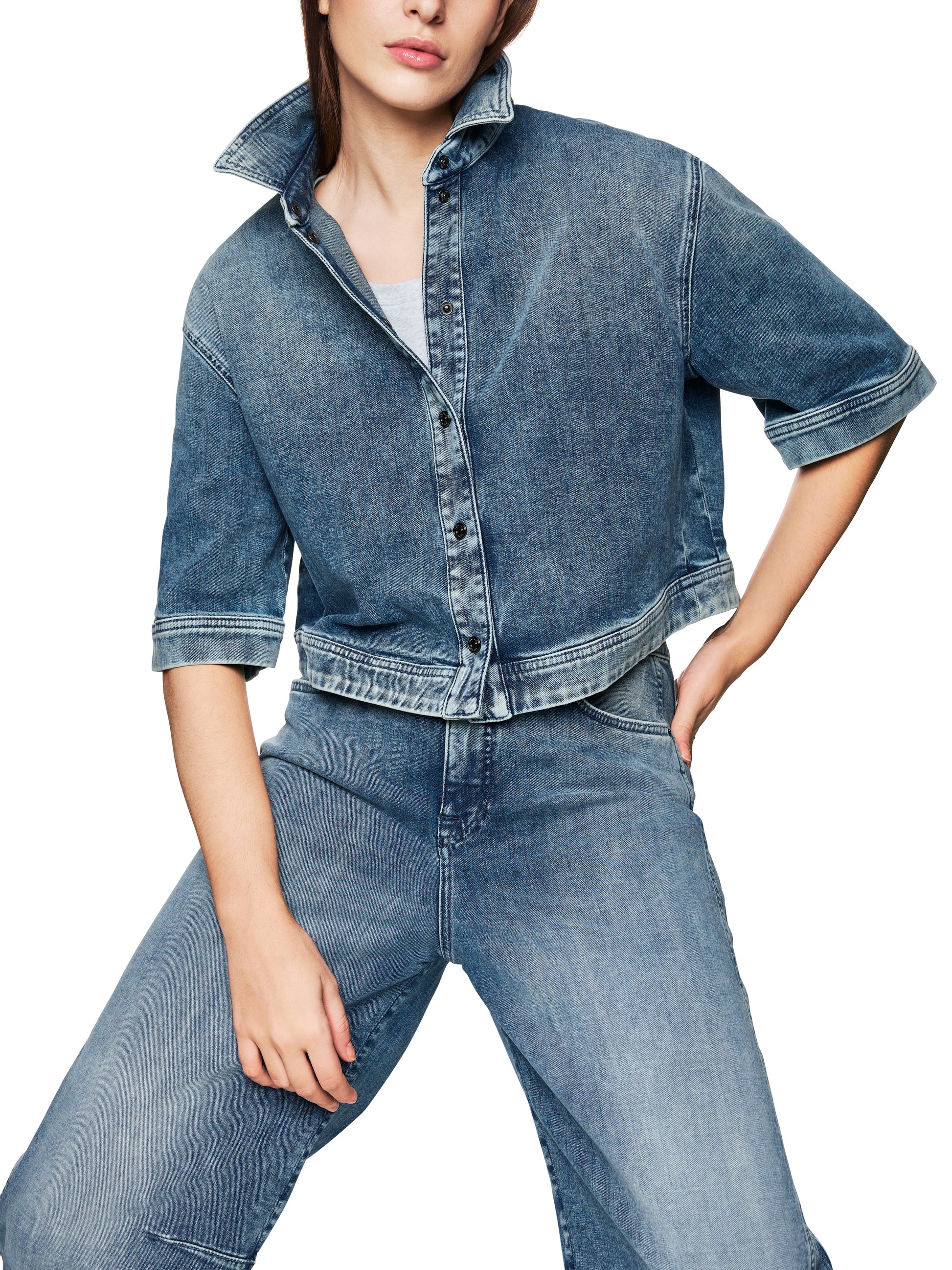 This unconventional denim blouse has a wide, cropped cut. The sleeves are mid-length and also have a wide shape. This silhouette gives the design a unique look. The full-length row of press studs completes the overall look. This blouse is made from regenerative cotton with a small amount of stretch and is from the Rethink Together sustainability label.