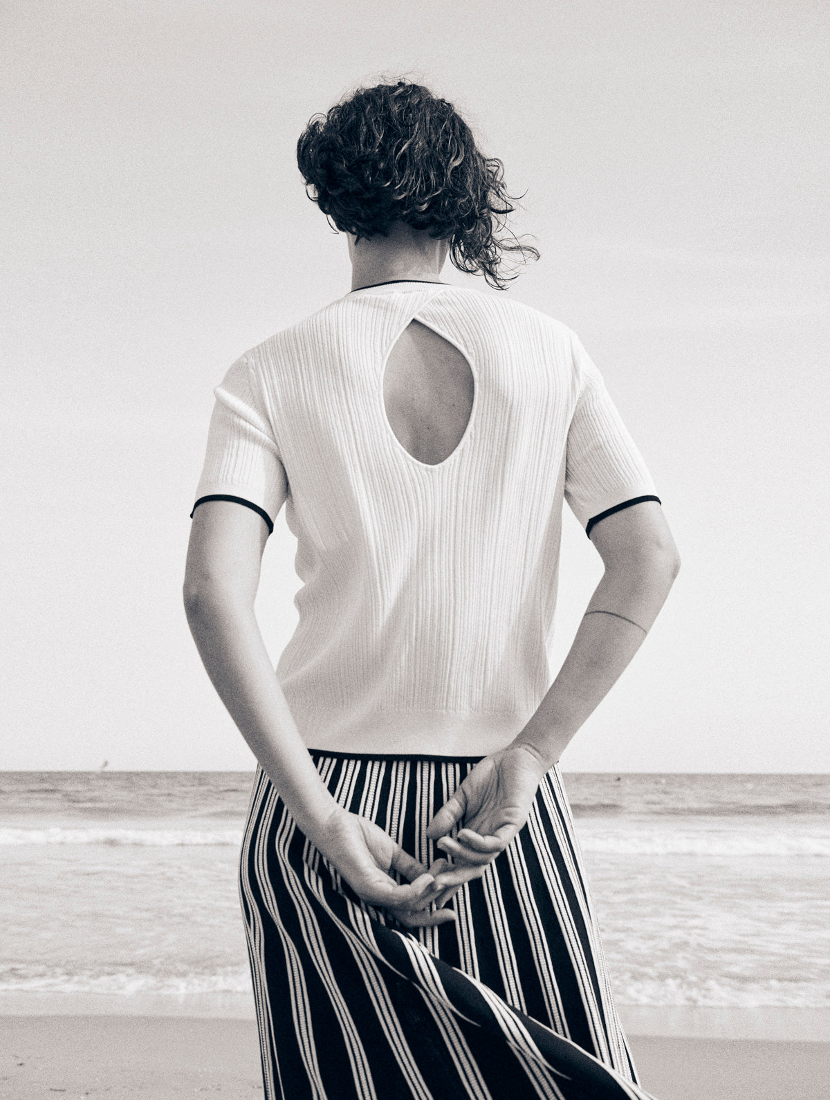 This knitted self stripe crew neck sweater is detailed with contrasting trim along the neckline, sleeves, and waistband. It includes a keyhole opening at the back, making it an ideal choice for transitioning from day to evening and from casual to professional settings. Pair it effortlessly with the knitted Sita Murt skirt or simply with denim shorts for a versatile look.