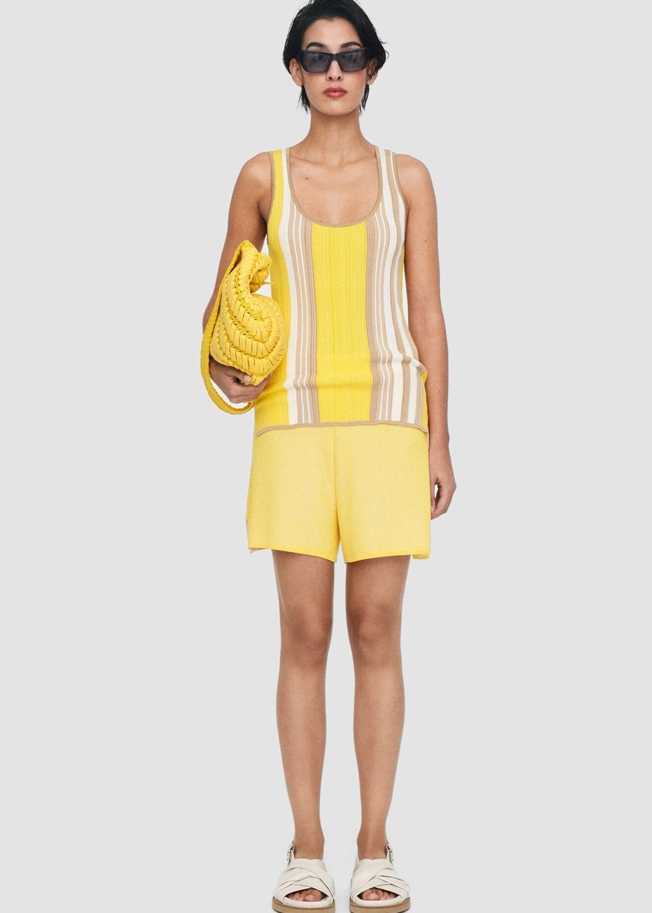 The Colour Block Rib Tank Top is a regular fit top, crafted from a blend of viscose and cotton which has a matte shiny finish. Complete in irregular rib stitching with graphic stripes, this vibrant top features an open neckline and small side slits at the hemline. Lightweight and easy wearing, this piece will brighten any summer look.