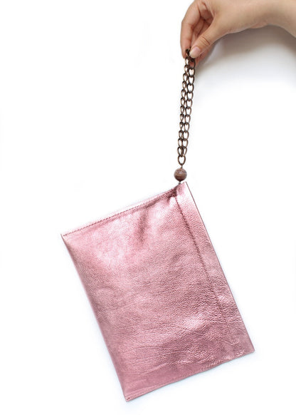 Metal pink lamb leather clutch with bronze chain bracelet as zipper pull. Agathe stone. Rose satin lining.