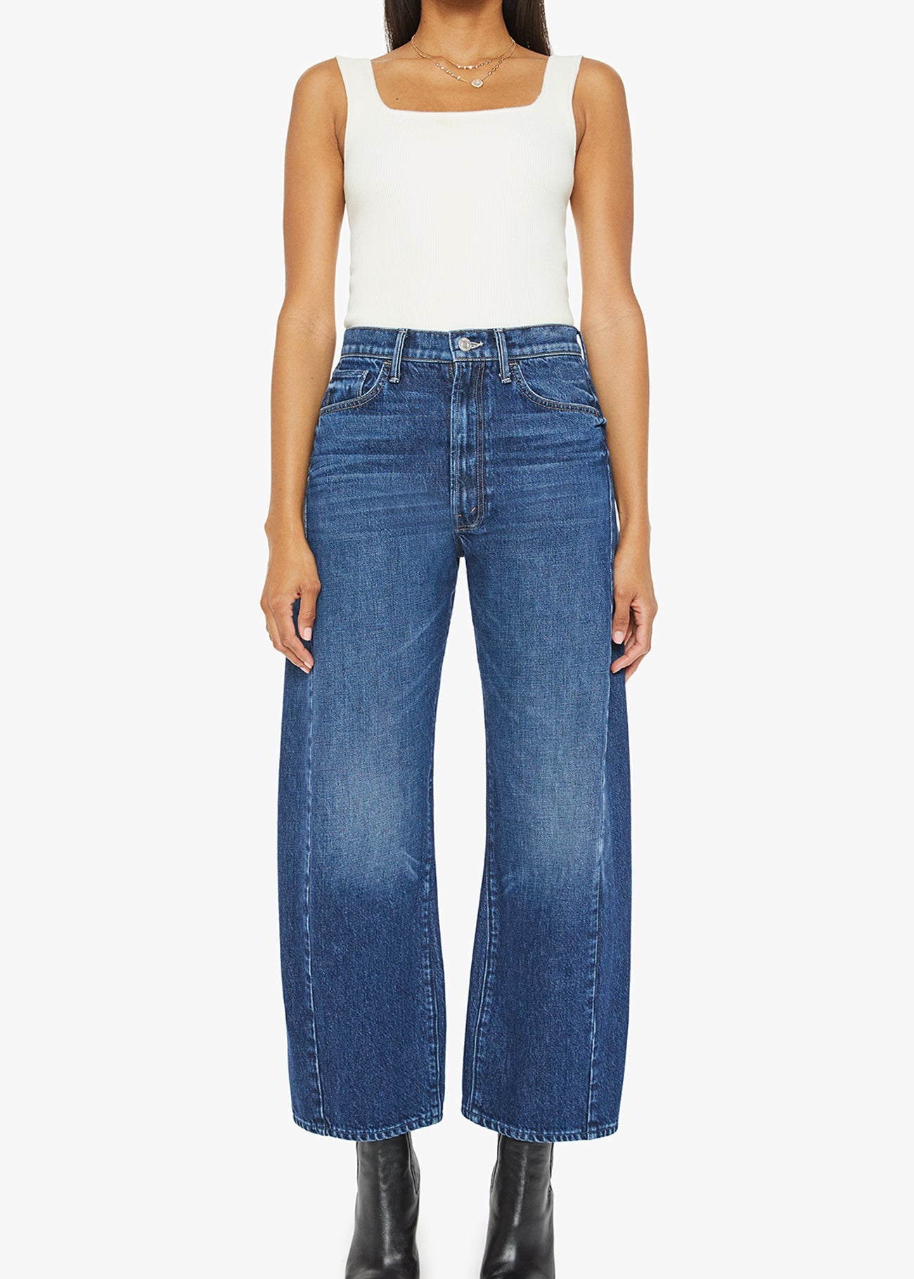 High hopes. A super high-waisted jean with a wide, curved leg, an ankle-length inseam and a clean hem. Made from SUPERIOR denim, Did You Bring Me Anything? is a dark blue wash with whiskering and fading at the knees.