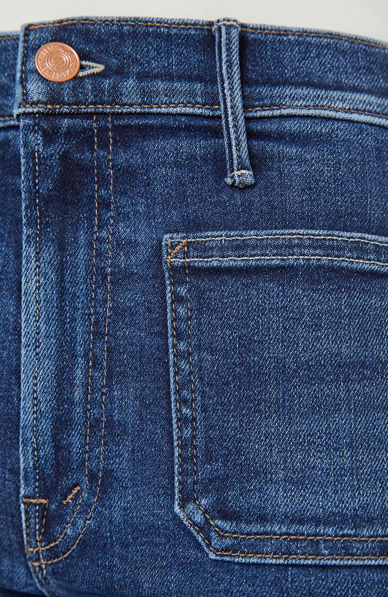 Hail Mary. 70s-inspired wide leg jeans with a high rise, zip fly, patch pockets, 31-inch inseam and a clean hem. Made from stretch denim, One Last Shot is a dark blue with subtle whiskering and fading at the knees.
