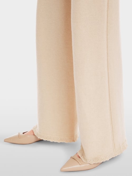The WINDER are a pair of slip-on trousers in an elegant wool blend with silk and cashmere. The cut is defined by the high waistband and wide leg. The hem is embellished with a delicate lace trim. Looks great with silk and contrasts with shine. This garment has the Rethink Together sustainability label and is knitted and finished in Germany using the latest technologies. The individual parts, such as the back and front etc., are sewn together at European partner companies.